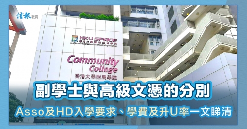 2025 HKDSE預計於7月16日放榜,不少考生均會選舉報讀副學士(Asso)及高級文憑(HD),作為繼續升學的途徑。到底副學士與高級文憑有什麼分別?副學士及高級文憑升大學率是多少?Asso及HD入學要求是什麼?Asso及HD學費幾多錢?本文為你詳細整合相關資訊,助你一文睇清副學士與高級文憑的分別,以揀擇適合自己的課程。