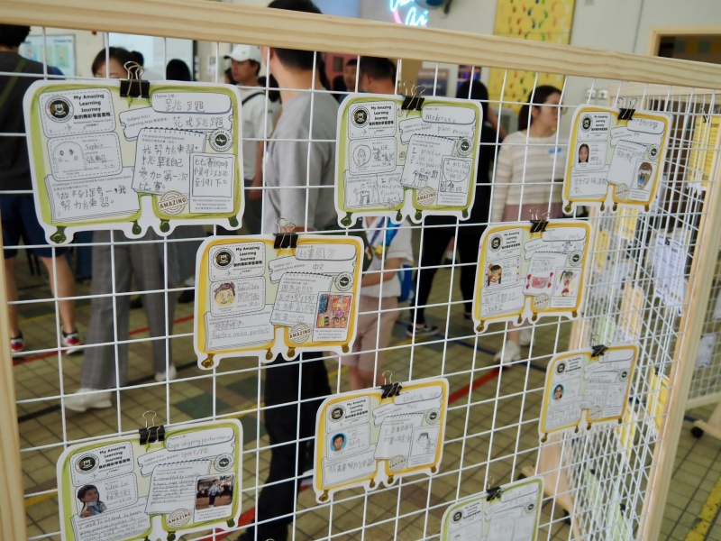 澆灌「自我覺察」的種子,校本設計的「成就寶藏卡」成為關鍵。孩子們透過圖文並茂、各具特色的卡片,回顧成長軌跡,真實記錄小小的心靈經歷——無論是「他人的幫助、安慰」,還是「自己定義的困難、挫折」,抑或充滿童真的想法,都具體生動地呈現。這些卡片懸掛於展品旁或貼在展品附近的牆上,一字一句凝聚著老師回應每個展示意願的心力,更成為孩子成長的印記與寶藏,彷彿都在微微發光,映照出作品背後的歷程。