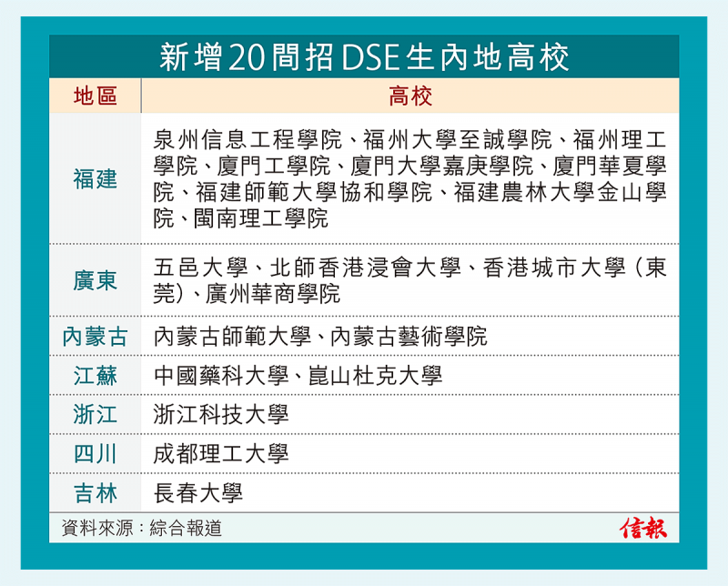 教育局公布,下一個學年(2026/27學年)內地再多20所高等院校招收香港中學文憑試(DSE)學生,總數增至165所,分布內地21個省/直轄市及兩個自治區,包括首次有內蒙古自治區的院校參與。下月1日起接受應屆DSE考生報名。