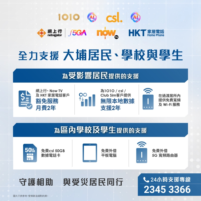 - HKT現已與大埔學區內多間學校成功聯繫,為受影響的學生及教師義務提供數據電話卡、5G寬頻路由器及平板電腦借用,確保學校與受影響學生及家庭保持聯繫。若區內仍有其他機構或學校需要支援,歡迎透過各社交媒體平台與我們聯絡。