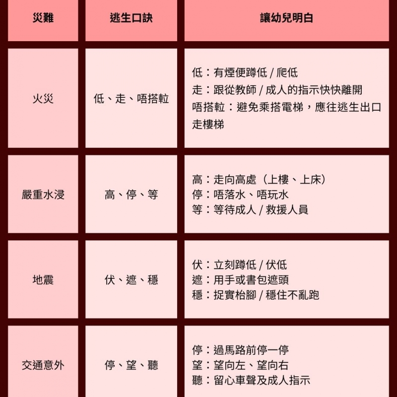 3. 學習家校一致的「應急用語」︰在緊急情境最怕幼兒混亂。家校可向幼兒灌輸一致的逃生常識,以「簡單口訣、容易記住」為原則幫助幼兒理解,亦方便於家中與學校同步練習。