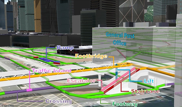 香港的天橋和斜路眾多,平面地圖往往無法清楚顯示每條路線的細節。三維行人道路網利用三維數據,能夠清晰區分上落斜行人路和提供行人徑的長度,從而大幅提高步行時間計算的準確性,幫助尋找最快且最直接的路徑。相比以往的二維平面地圖,三維行人道路網不僅提升了城市空間資訊分析的精準度,也為市民日常出行提供了更為便捷和準確的導航方式,展示了香港在智慧城市建設方面的前瞻性。