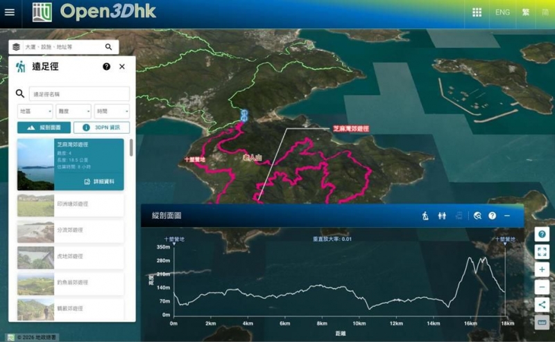 除市區外,地政總署亦把三維行人道路網擴展至郊野公園遠足徑,使香港自然景區的行走路線得以數位化和三維化。過去,公眾未必能輕易了解遠足徑的具體資訊,但隨着三維行人道路網的擴展,市民可瀏覽「Open3Dhk」線上應用平台,不僅能夠預覽各條山徑的立體地形與難度等級,還能獲得有關坡度及設施的詳細資料,有助規劃適合自身體能的行程。此類資訊不僅提升了遠足的安全性,也鼓勵更多人探索郊野,享受大自然的美好,同時亦可進一步善用香港山海都市近在咫尺的特質,吸引遊客探索山徑等相關綠色旅遊。