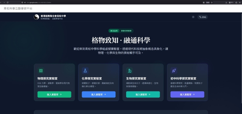 在數碼轉型與人工智能(AI)迅速發展的時代,香港道教聯合會青松中學推出「青松AI科學互動學習平台」,以科技重新定義理科教學,使科學更直觀、更有趣。本平台由青松中學的教師親自研發,旨在突破傳統實驗室在資源、課時與安全上的限制,並回應學生多元化的學習需求,推動自主學習與跨學科整合。